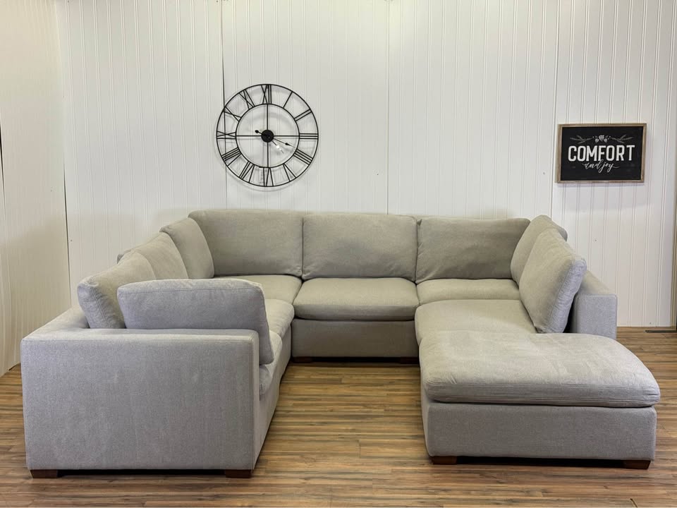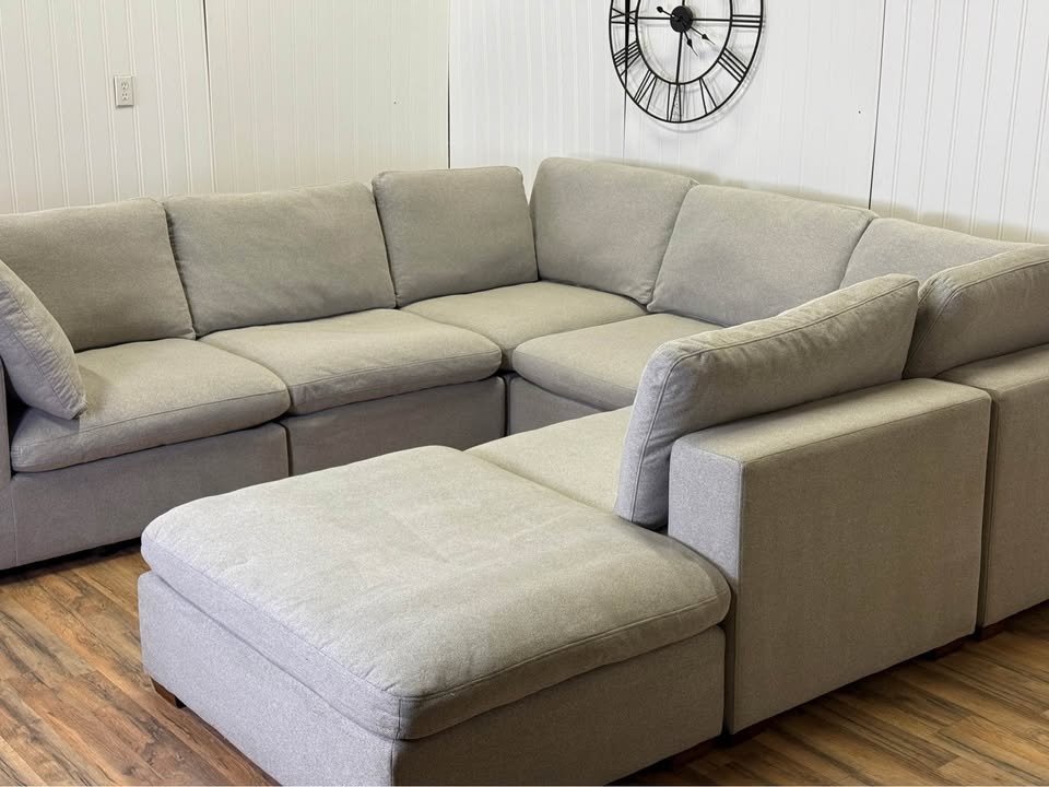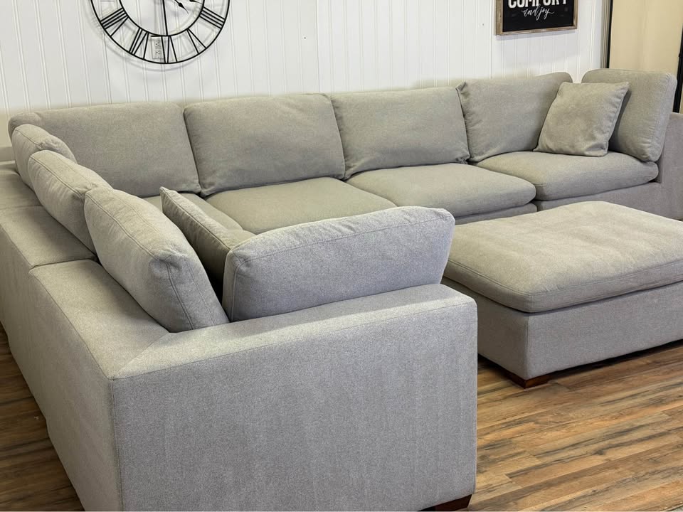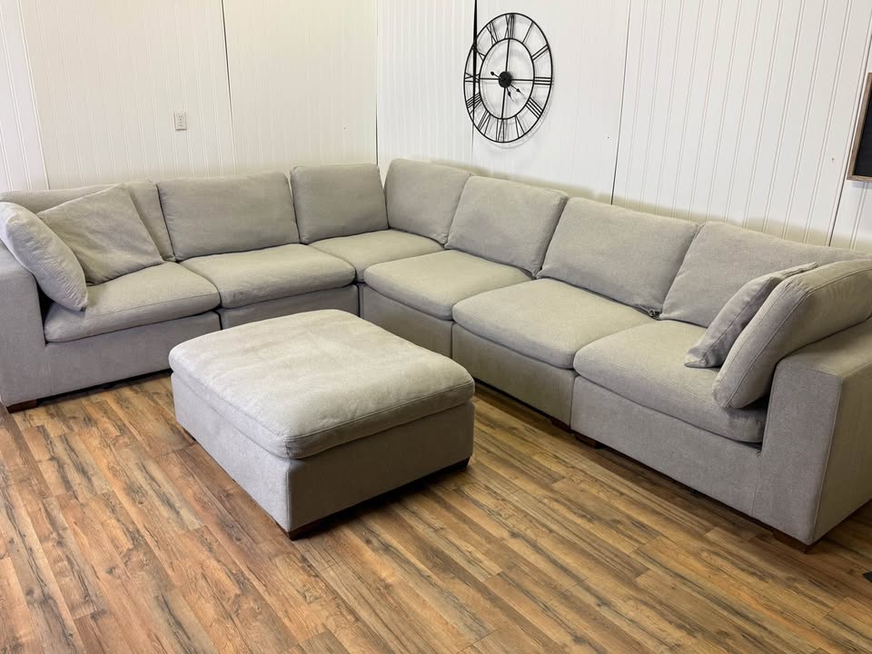 Light gray modular 6-piece sectional sofa with ottoman. The couch is very clean, comfortable and is in excellent condition.